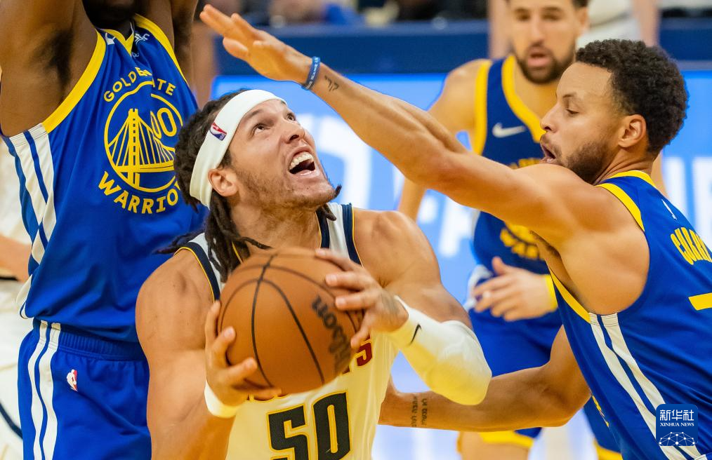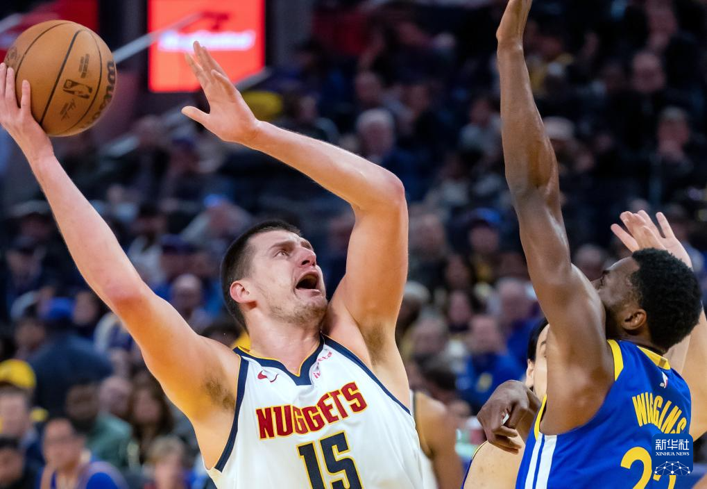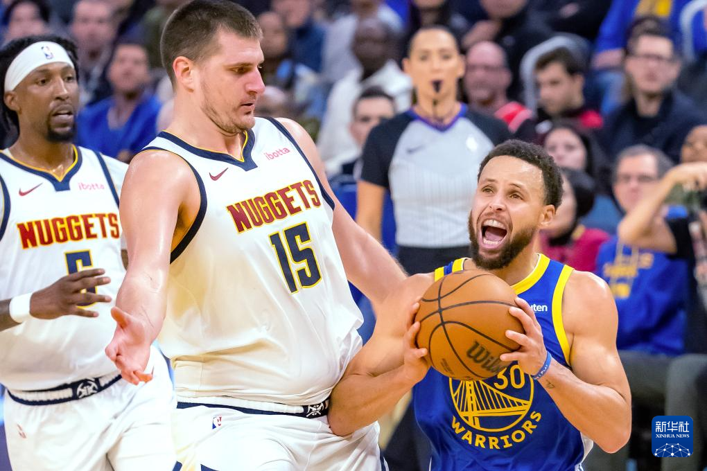 1月4日,掘金队球员尼古拉·约基奇(中)在比赛中防守勇士队球员库里(右)。新华社发(董旭东摄)