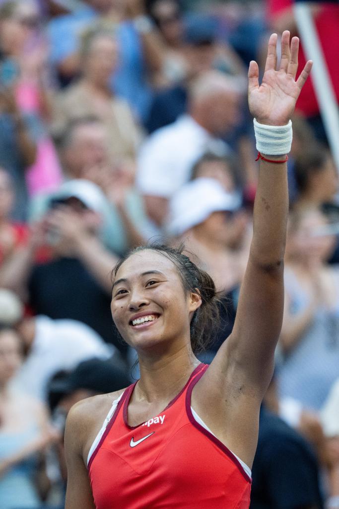 2023年9月4日,郑钦文在美国网球公开赛女子单打比赛中晋级八强后庆祝。新华社记者 刘杰 摄