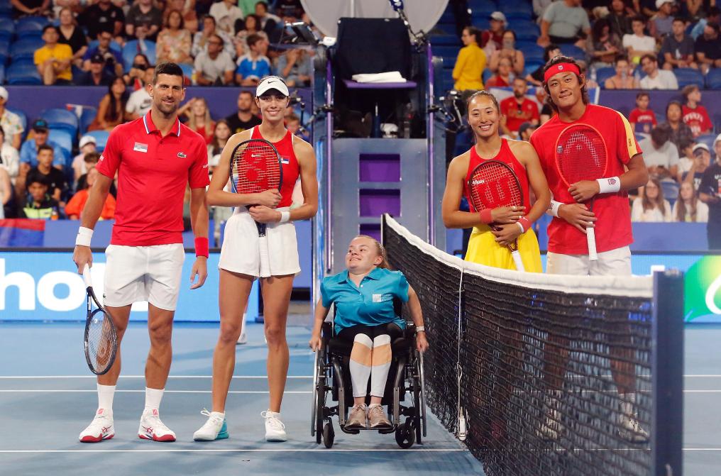 2023年12月31日,中国组合郑钦文(右二)/张之臻(右一)与塞尔维亚组合焦科维奇(左一)/丹尼洛维奇(左二)在联合杯混双比赛前合影。新华社发(周丹摄)