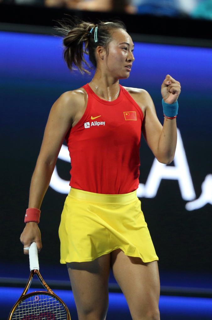 2023年12月31日,中国选手郑钦文在联合杯比赛中庆祝得分。新华社发(周丹摄)