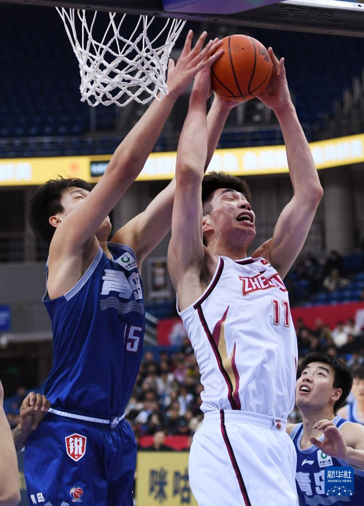 1月6日,浙江稠州金租队球员余嘉豪(右)在比赛中与青岛国信水产队球员杨瀚森拼抢。