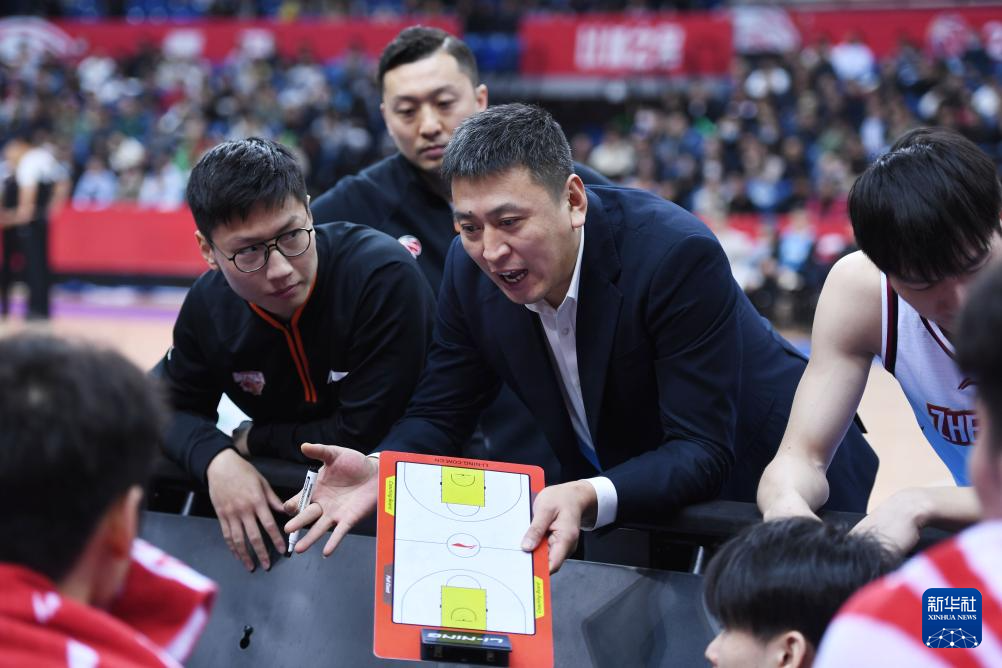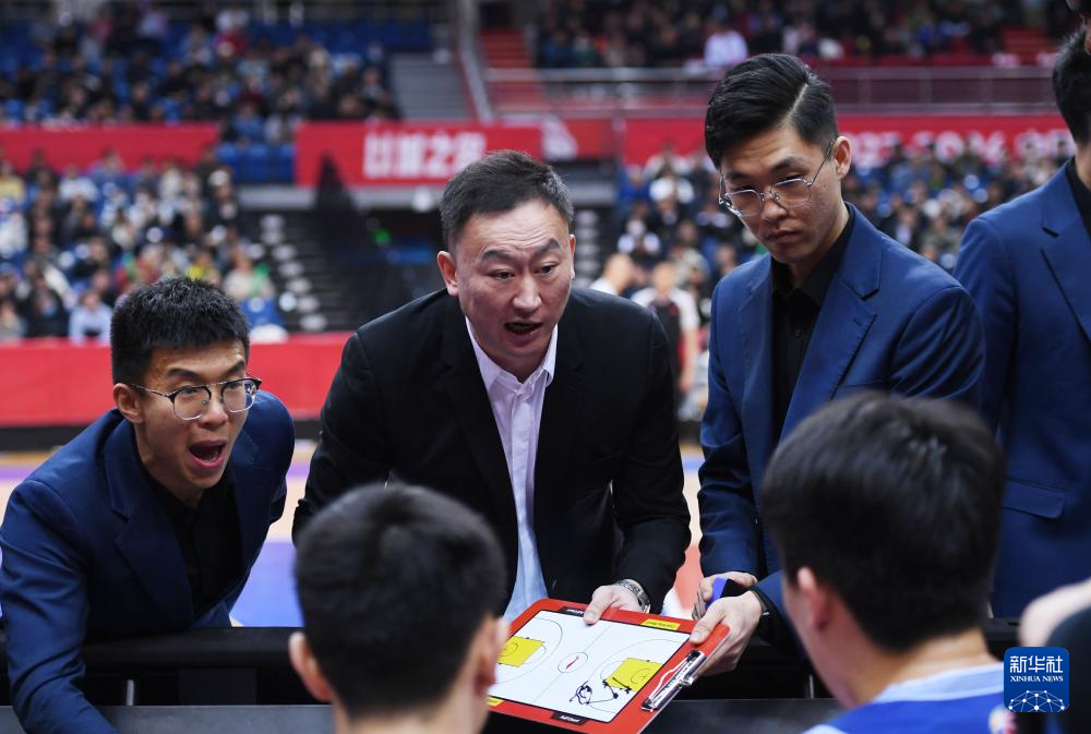 1月6日,浙江稠州金租队主教练王世龙(中)向队员布置战术。