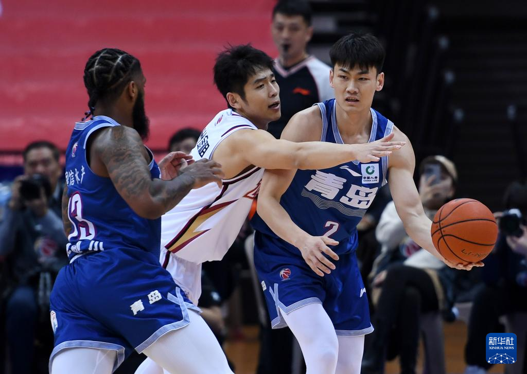 1月6日,青岛国信水产队球员王睿泽(右一)在比赛中传球。