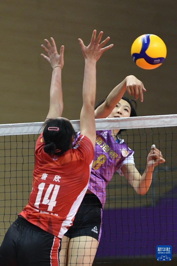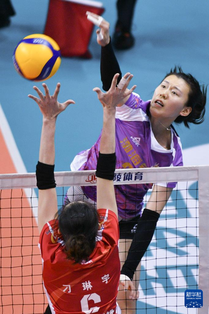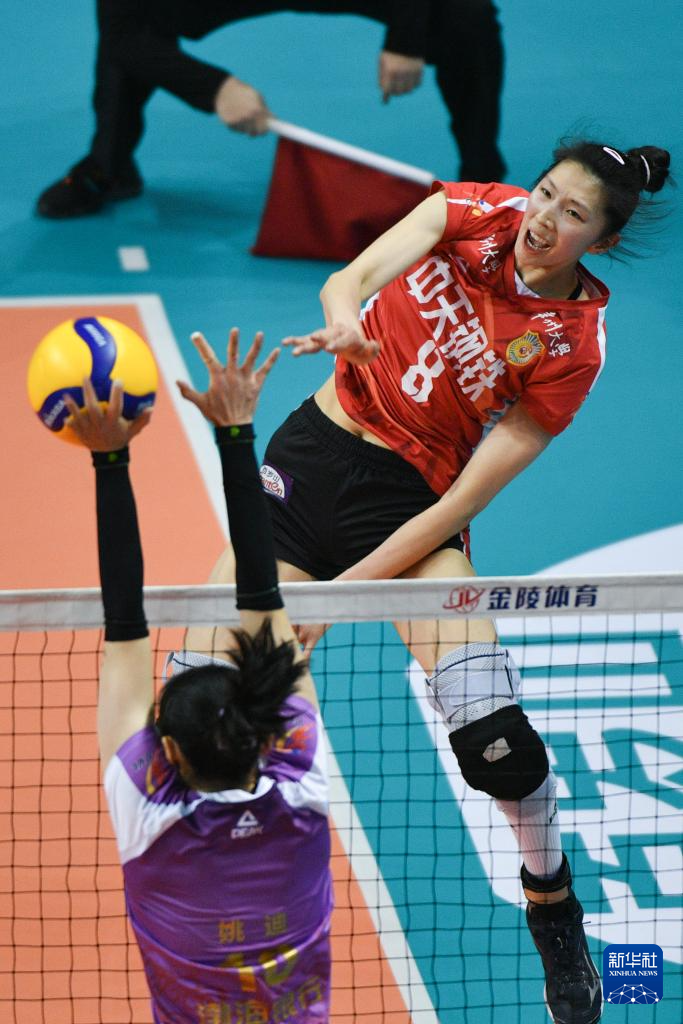 1月6日,天津渤海银行队球员袁心玥(右)在比赛中扣球。