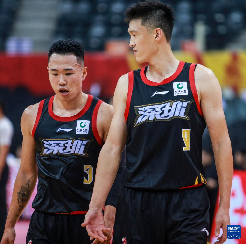 1月6日,深圳马可波罗队球员周鹏(右)与队友贺希宁交流。