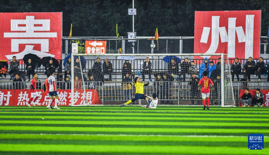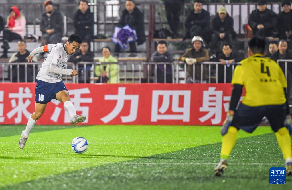 1月7日,“村超”上赛季射手王、忠诚村球员董永恒(左)在比赛中射门。新华社记者 陶亮 摄