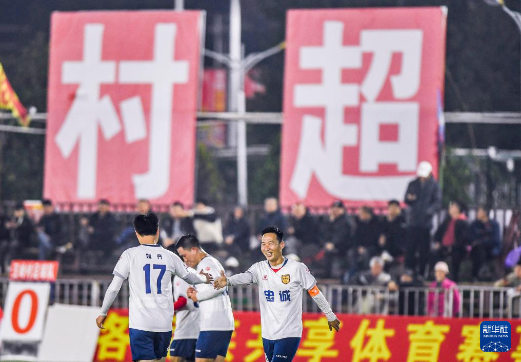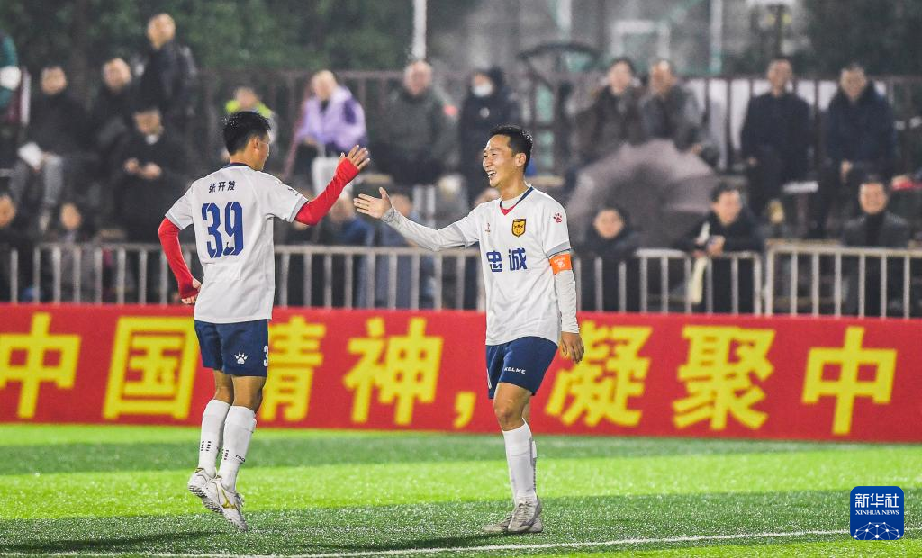 1月7日,“村超”上赛季射手王、忠诚村球员董永恒(右)在进球后和队友庆祝。新华社记者 陶亮 摄
