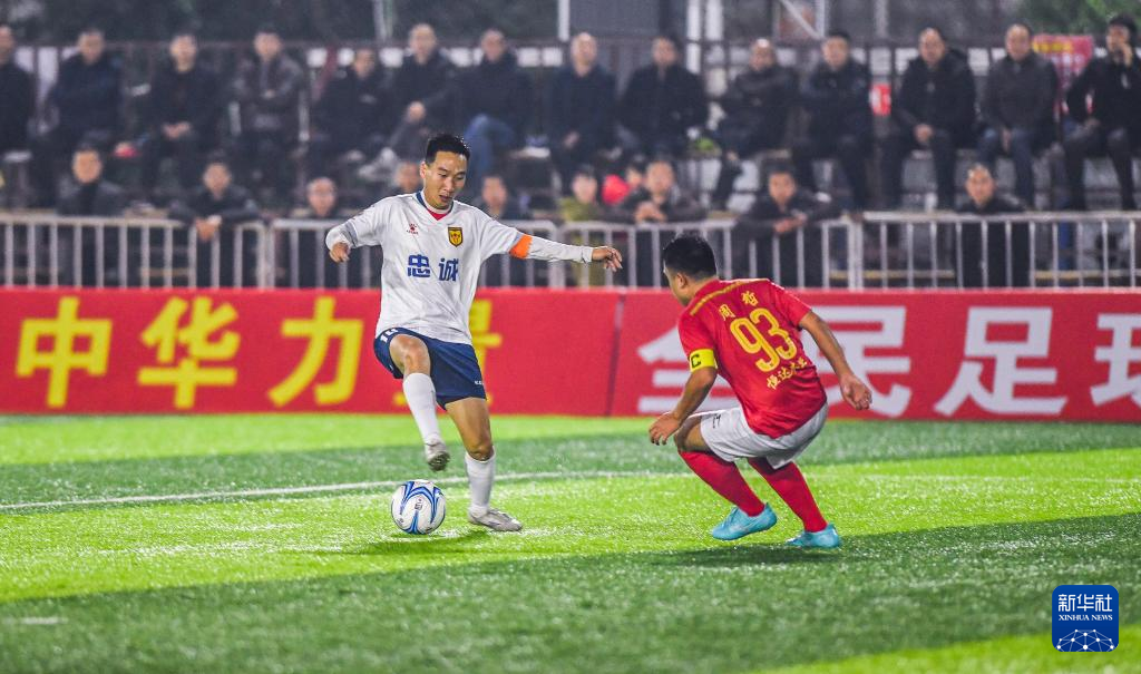 1月7日,“村超”上赛季射手王、忠诚村球员董永恒(左)在比赛中带球突破。新华社记者 陶亮 摄