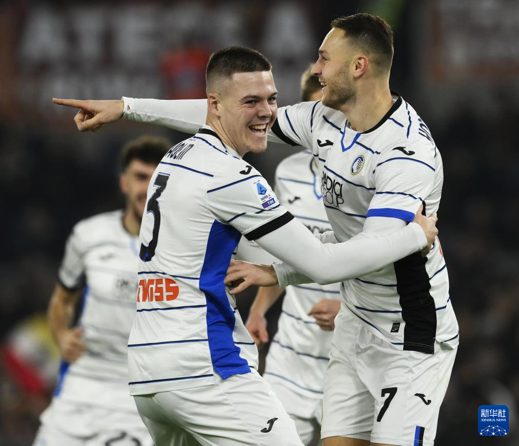 1月7日,亚特兰大队球员库普梅纳斯(右)在比赛中与队友米兰丘克庆祝进球。新华社发(奥古斯托·卡萨索利摄)