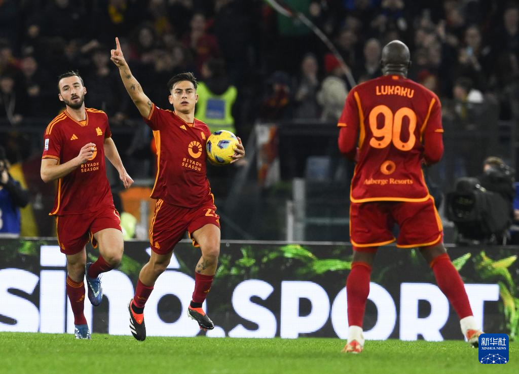 1月7日,罗马队球员迪巴拉(中)在比赛中庆祝进球。新华社发(奥古斯托·卡萨索利摄)