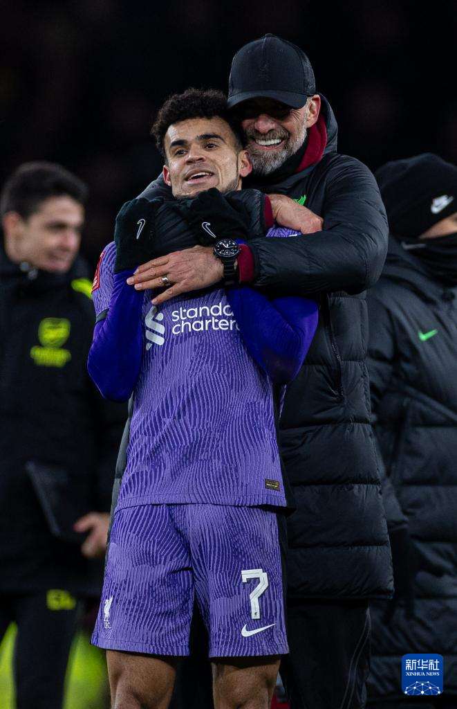 1月7日,利物浦队主帅克洛普(右)在比赛后与球员迪亚兹庆祝。新华社发