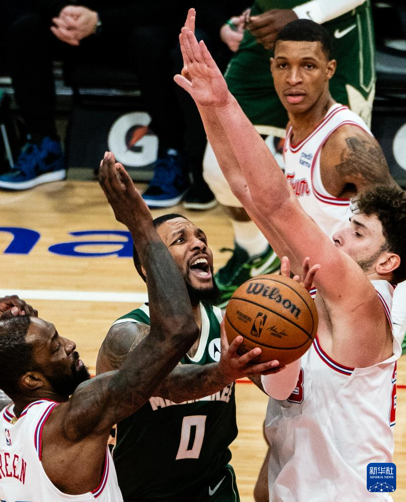 1月6日,雄鹿队球员利拉德(左二)在比赛中上篮。新华社发(陈晨摄)