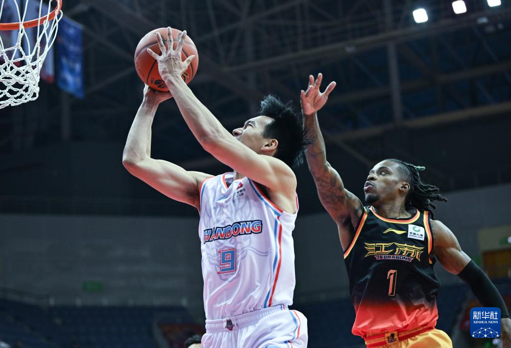1月8日,山东高速队球员陈玖璋(左)在比赛中上篮。新华社发(王须中摄)