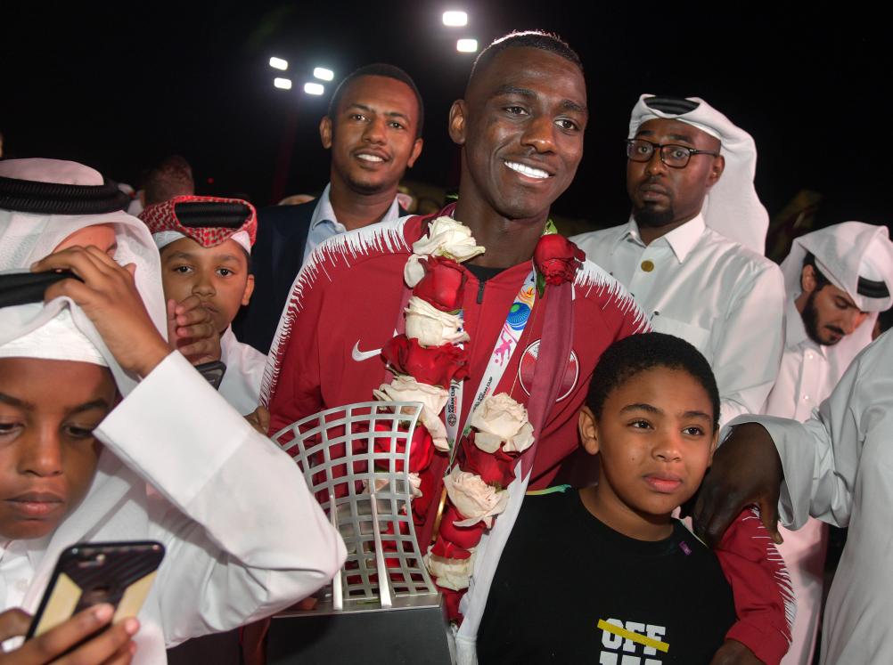图为2019年亚洲杯最有价值球员阿里(中)返回卡塔尔首都多哈,受到隆重欢迎。新华社发(尼库摄)