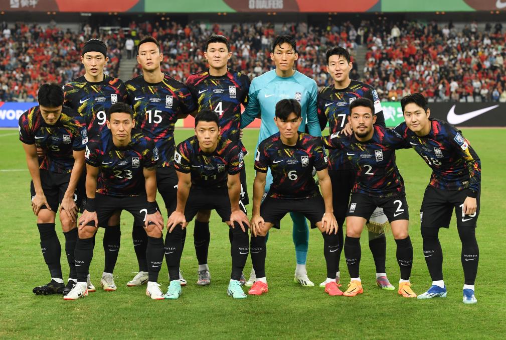 图为2023年11月21日,在广东深圳举行的2026年国际足联世界杯亚洲区预选赛36强赛C组比赛中,韩国队首发球员在赛前合影。