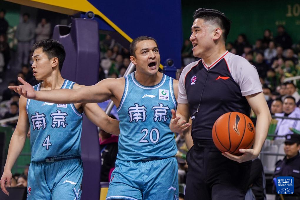 1月10日,南京头排苏酒队球员兼主教练西热力江(中)在比赛中与裁判交流。新华社记者 李博 摄