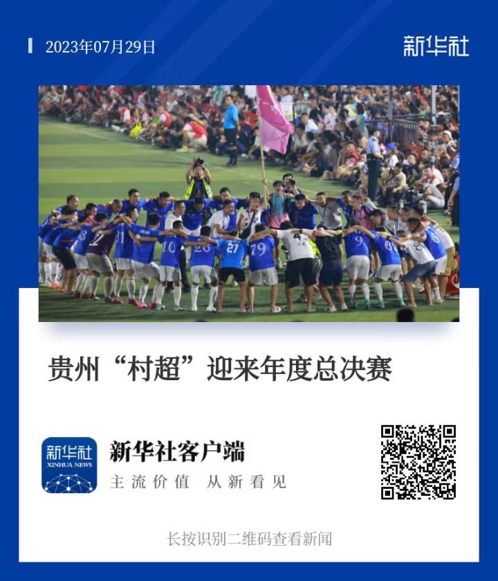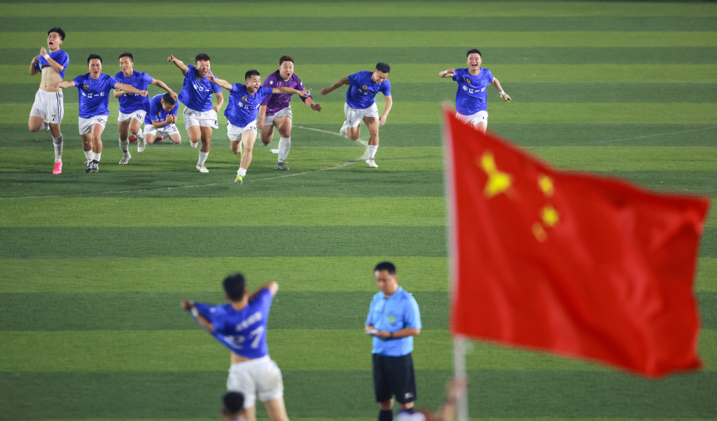 ↑2023年7月29日,获得“村超”总冠军的车江一村队球员在夺冠后庆祝。