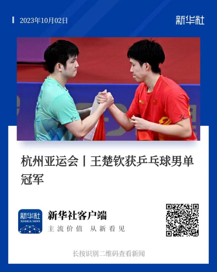↑2023年10月2日,在杭州亚运会乒乓球项目男子单打决赛中,中国选手王楚钦以4比3战胜队友樊振东,夺得金牌。