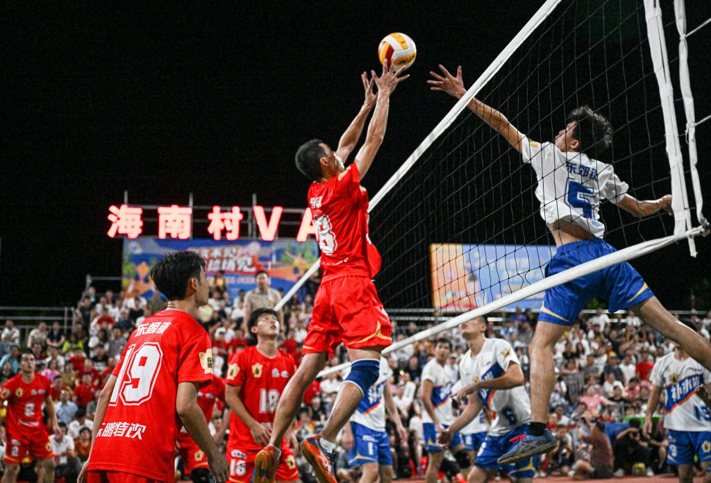 2023年8月13日,在“村排”决赛中,东郊镇队(右)对阵东阁镇队。新华社记者 蒲晓旭 摄