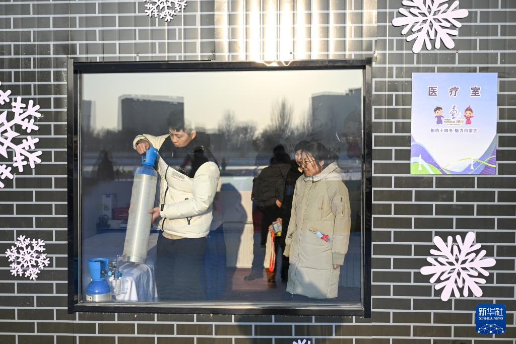 1月10日,工作人员在东河冰场布置医务室。新华社记者 贝赫 摄