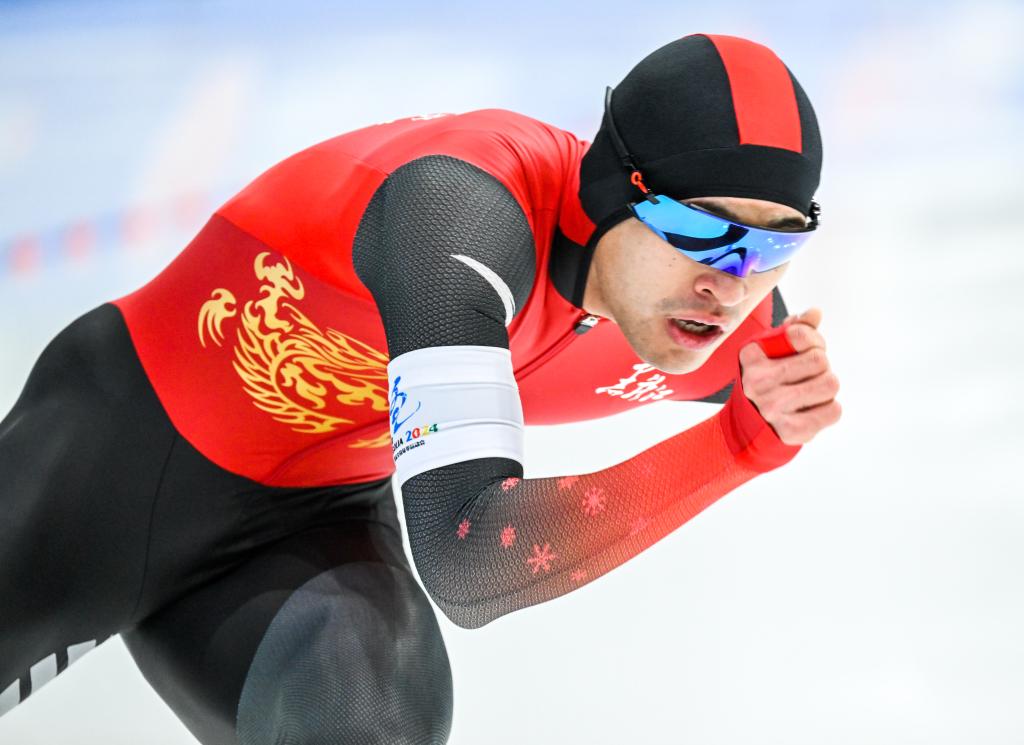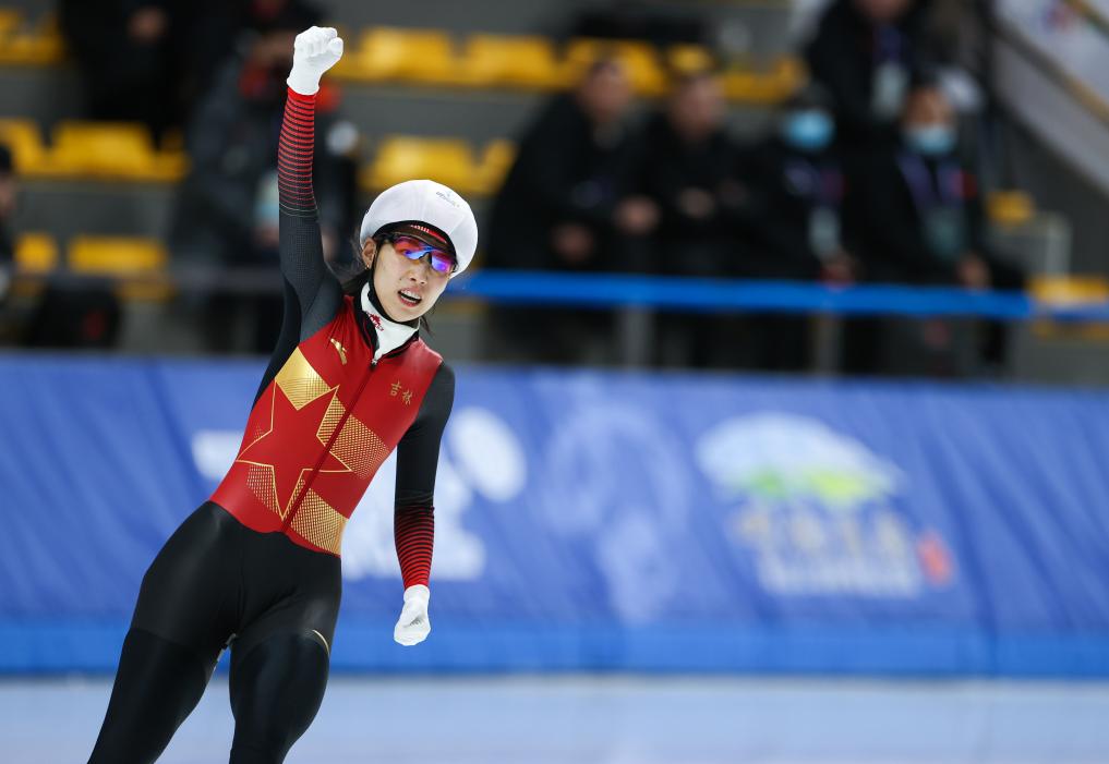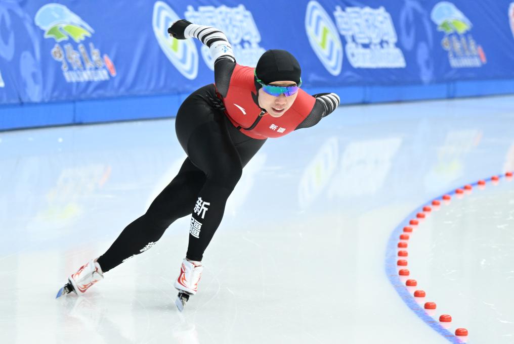 1月11日,第十四届全国冬季运动会速度滑冰公开组女子1000米比赛,新疆队殷琦获得冠军。新华社记者 连振 摄