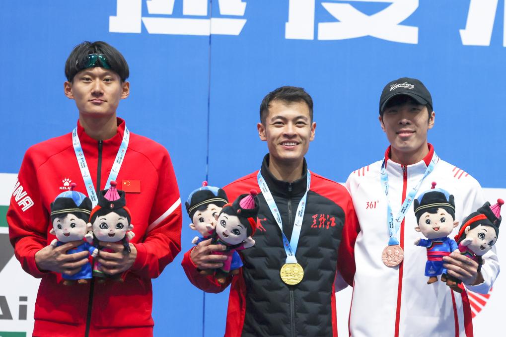 1月11日,冠军宁忠岩(中)、亚军王浩田(左)和季军廉子文在颁奖仪式上合影。新华社记者 王楷焱 摄