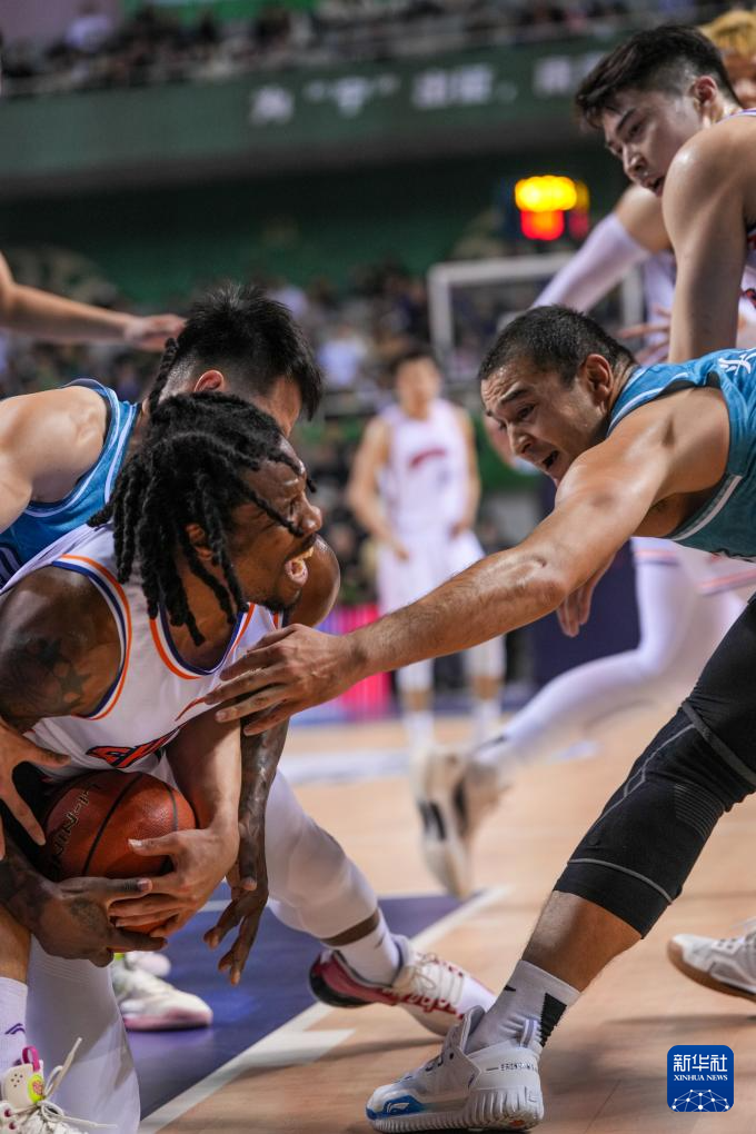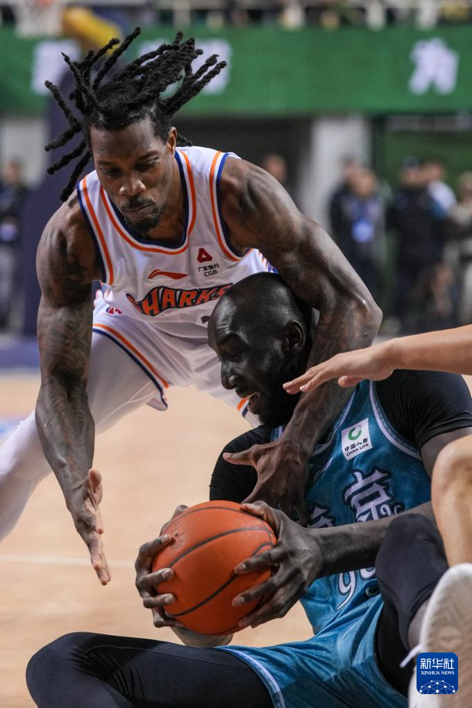 1月12日,上海久事队球员布莱德索(左前)与南京头排苏酒队球员兼主教练西热力江(右下)在比赛中拼抢。新华社记者 李博 摄
