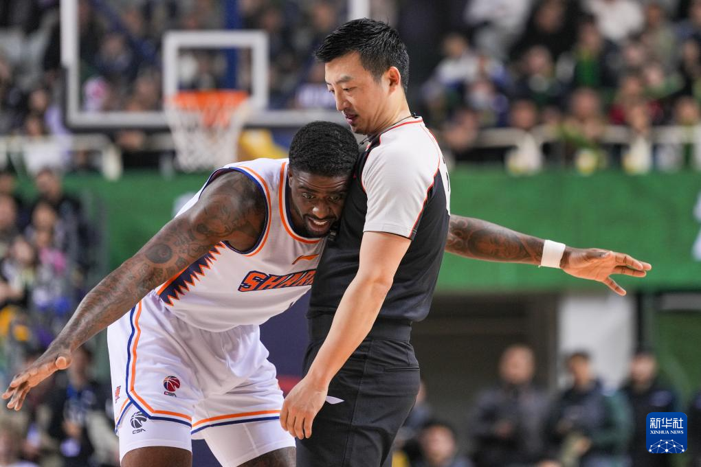 1月12日,上海久事队球员培根(左)在比赛中与裁判交流。新华社记者 李博 摄