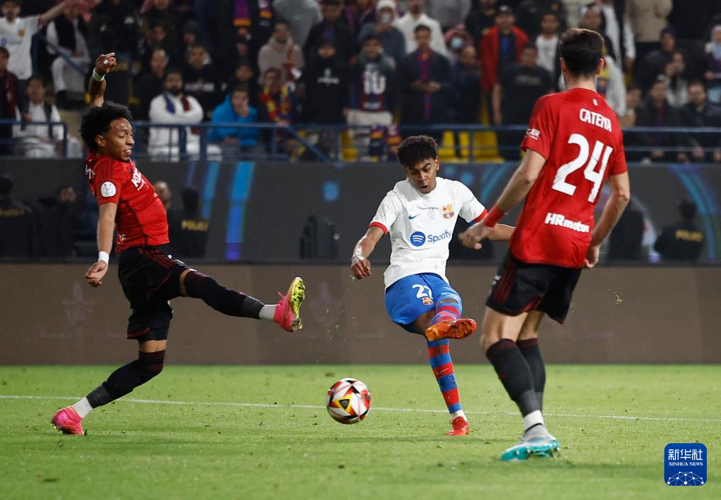 1月11日,巴塞罗那队球员亚马尔(中)在比赛中射门得分。新华社/路透