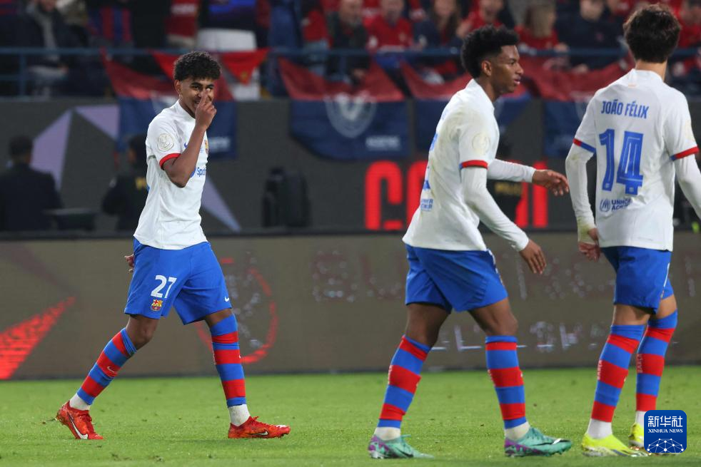 1月11日,巴塞罗那队球员亚马尔(左一)在比赛中庆祝进球。新华社/法新