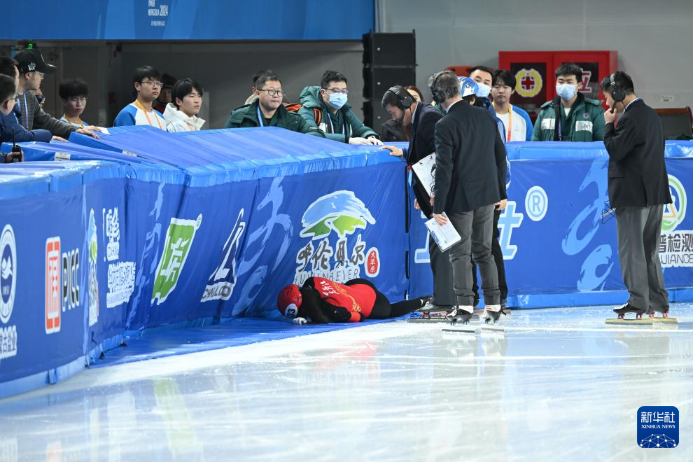 1月12日,黑龙江队选手闫僮瑶在比赛中摔倒。新华社记者 连振 摄