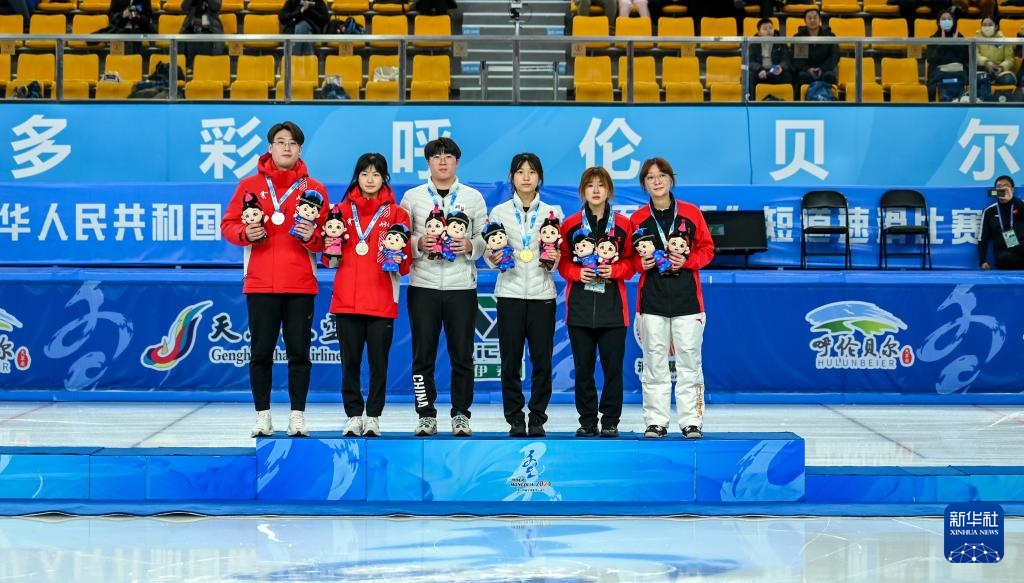 1月12日,冠军湖北队选手张澜馨(右三)、亚军内蒙古队选手杨茸秒(左二)和季军黑龙江队选手杨婧茹(右二)在颁奖典礼上合影。新华社记者 连振 摄