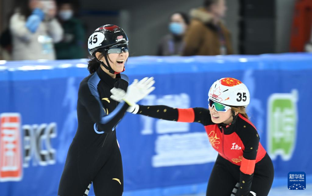 1月12日,湖北队选手张澜馨(左)与黑龙江队选手杨婧茹在赛后庆祝。新华社记者 连振 摄