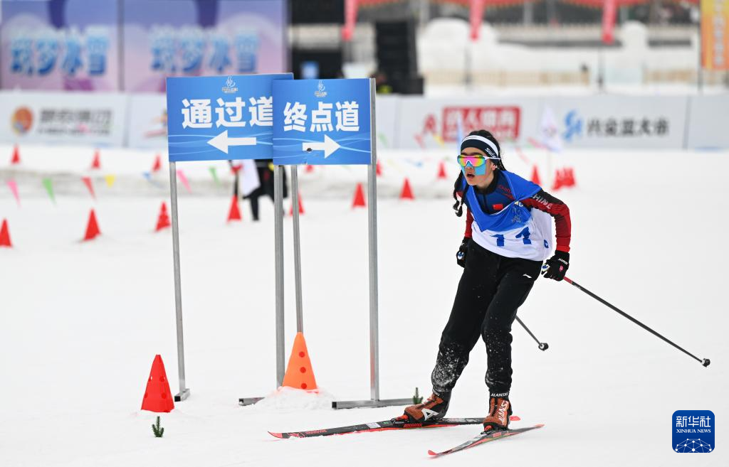 1月13日,湖南队选手陈佳敏在女子4X1公里团体接力(自由技术)比赛中抵达终点。新华社记者 贝赫 摄