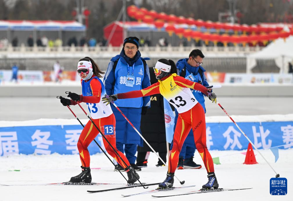 1月13日,新疆生产建设兵团队选手高乐(右)和松哈尔·哈斯别克在女子4X1公里团体接力(自由技术)比赛中交接。新华社记者 贝赫 摄