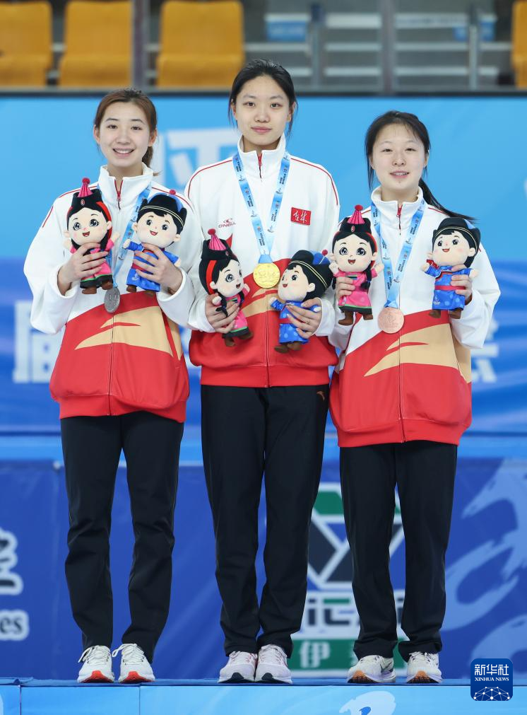 1月13日,冠军吉林队选手王晔(中)、亚军吉林队选手宋一霏(左)和季军吉林队选手宋佳蕊在颁奖仪式上合影。新华社记者 王楷焱 摄
