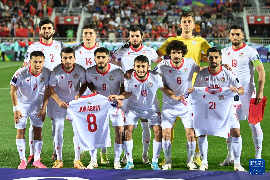 1月13日,塔吉克斯坦队首发球员在赛前合影。新华社记者 江汉 摄