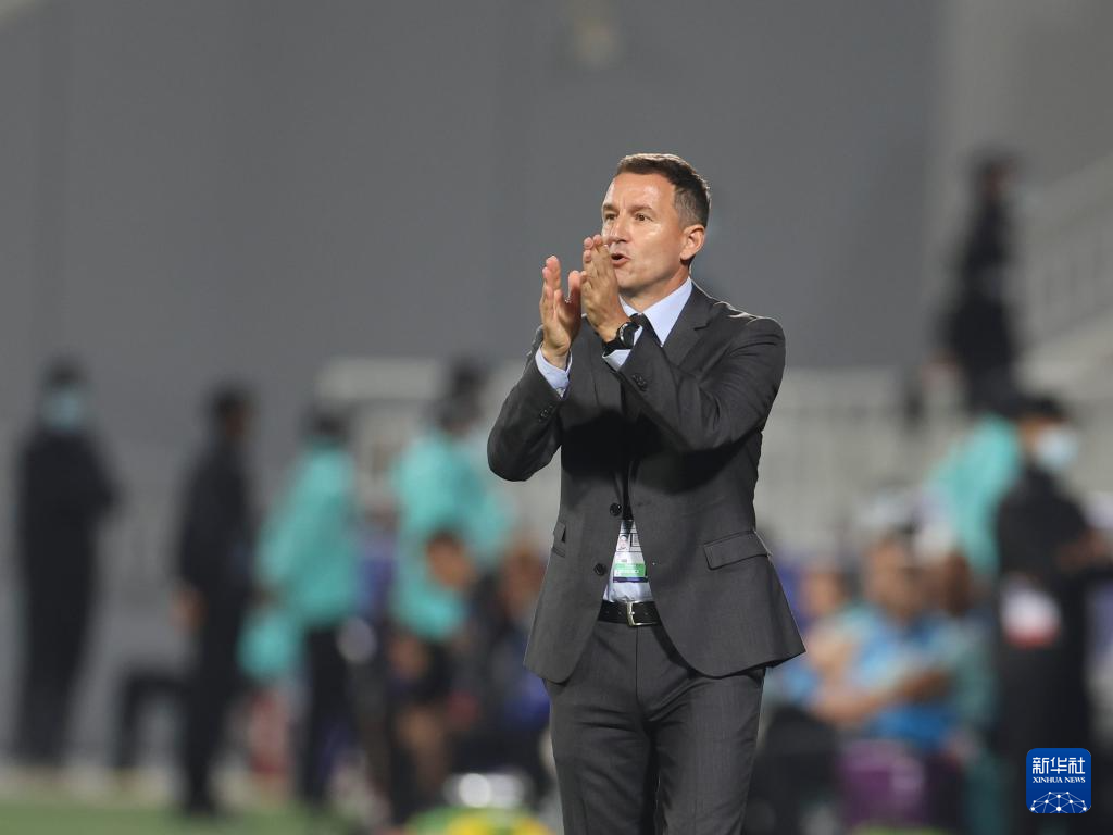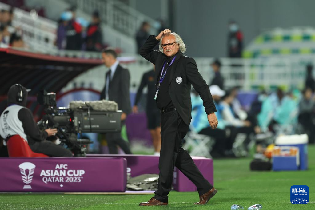 1月13日,塔吉克斯坦队主教练佩塔尔·舍格尔特在场边观赛。新华社记者 贾浩成 摄