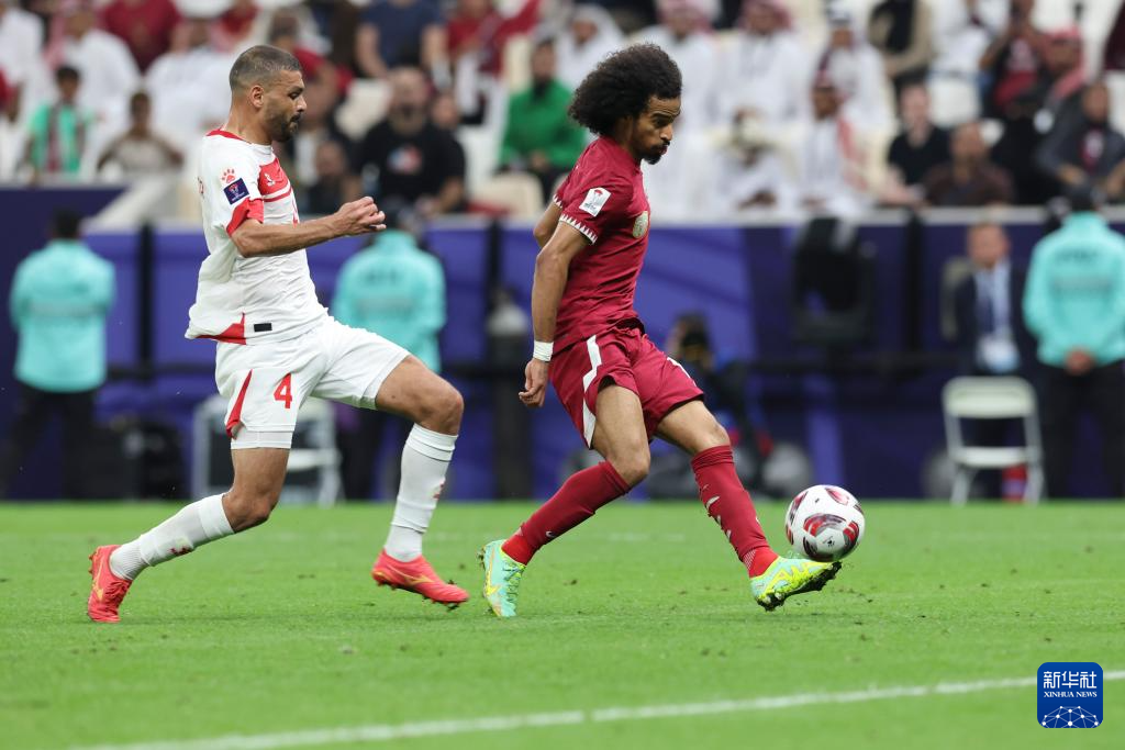 1月12日,卡塔尔队球员阿尔穆兹·阿里(中)在比赛中庆祝进球。新华社记者 曹灿 摄