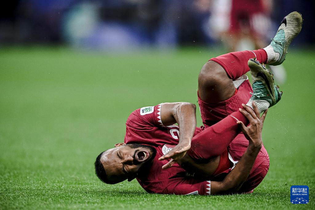 1月12日,卡塔尔队球员艾哈迈德·法特希在比赛中受伤倒地。新华社记者 江汉 摄