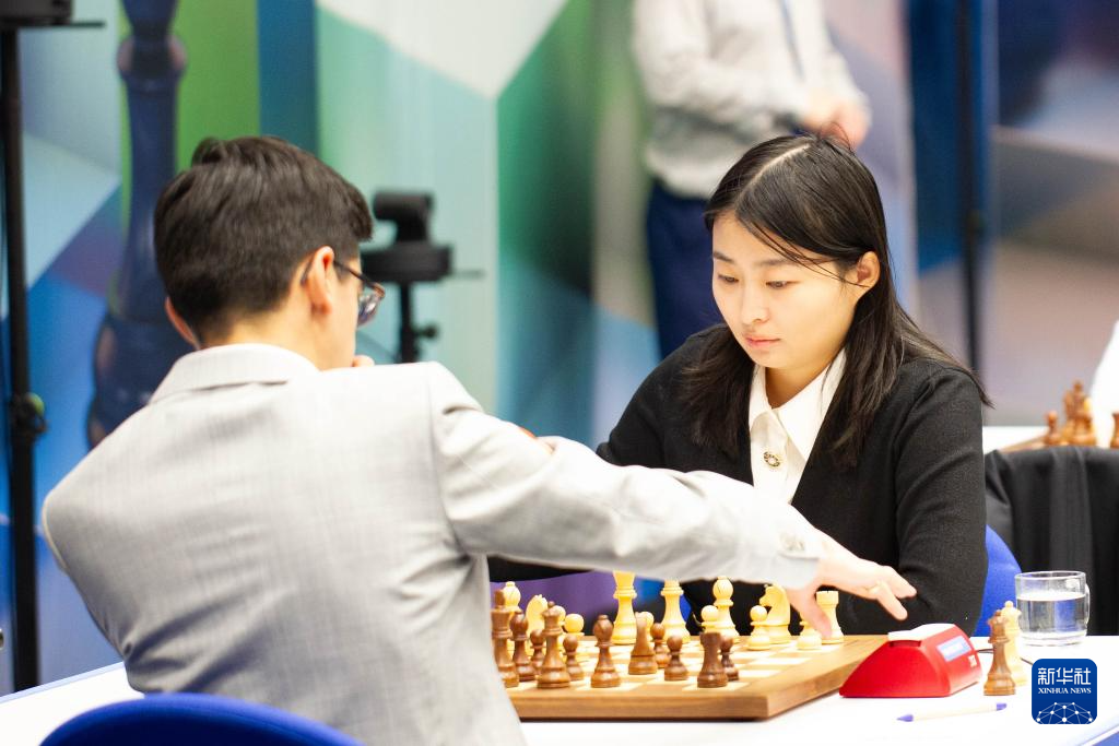 1月13日,中国选手居文君(右)在首轮比赛中与荷兰选手阿尼什·吉里对弈。新华社发(西尔维娅·莱德雷尔摄)