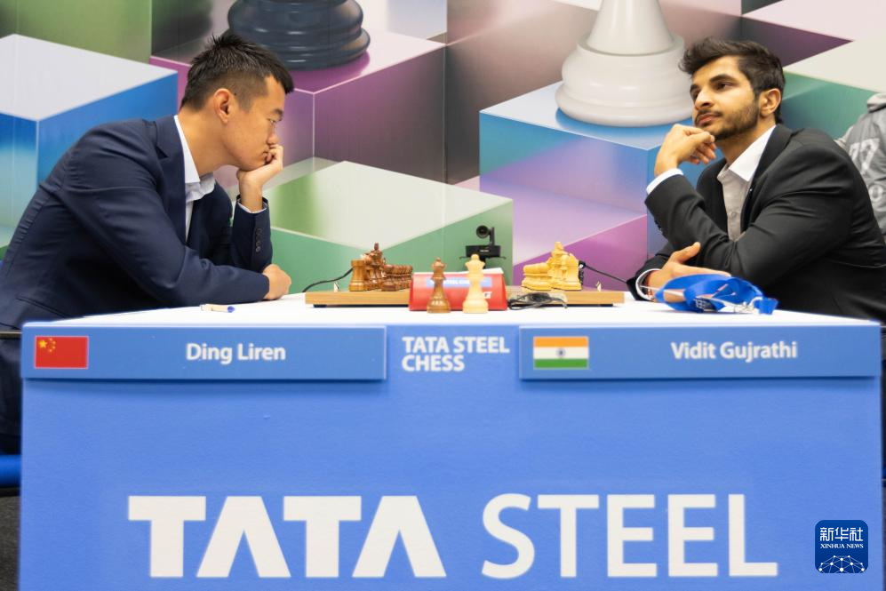 1月13日,中国选手丁立人(左)在首轮比赛中与印度选手维迪特对弈。新华社发(西尔维娅·莱德雷尔摄)