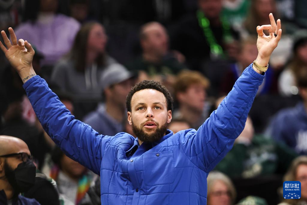 1月13日,勇士队球员库里在比赛中庆祝队友投中三分球。新华社发(乔尔·莱纳摄)