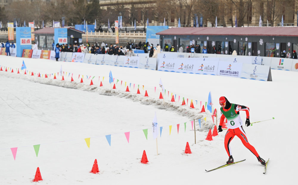 1月13日,黑龙江队选手王博文在男子4X1.5公里团体接力(自由技术)比赛中。当日,第十四届全国冬季运动会群众越野滑雪比赛在内蒙古呼和浩特市东河冰场开赛。新华社记者 贝赫 摄