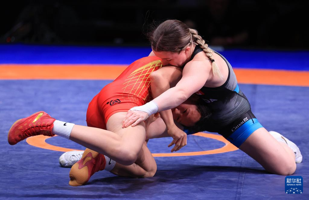 1月13日,中国选手冯泳欣(左)与加拿大选手泰勒在女子自由式57公斤级季军争夺战中。冯泳欣获得季军。新华社发(Pixsell图片社/马科·普尔皮奇摄)