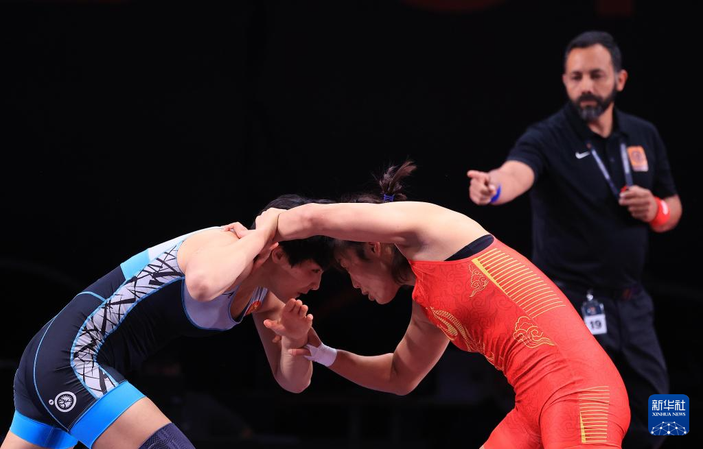 1月13日,中国选手王娟(前右)与吉尔吉斯斯坦选手艾佩丽·梅杰特·克济在女子自由式76公斤级决赛中。王娟获得亚军。新华社发(Pixsell图片社/马科·普尔皮奇摄)