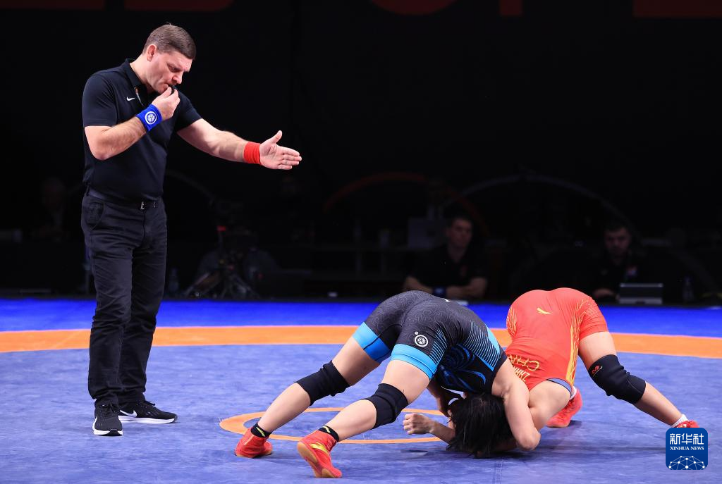 1月13日,中国选手张骐(右)与队友洪可新(中)在女子自由式57公斤级决赛中。洪可新获得冠军。新华社发(Pixsell图片社/马科·普尔皮奇摄)