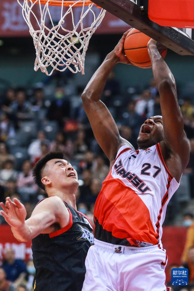 1月13日,江苏肯帝亚队球员卡巴(右)在比赛中上篮。新华社发(彭志刚摄)