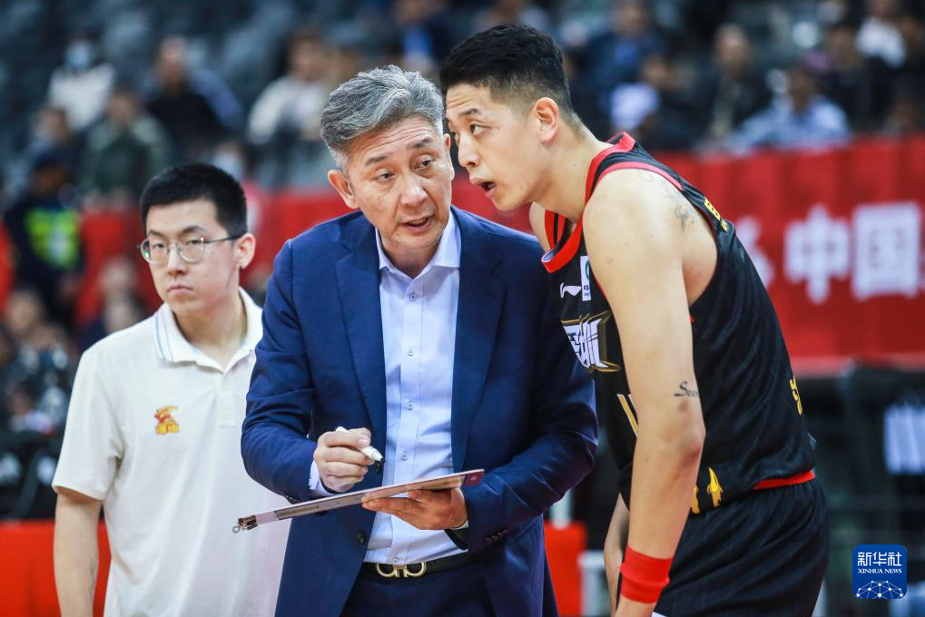 1月13日,深圳马可波罗队主教练郑永刚(右二)在场边为球员沈梓捷(右一)布置战术。新华社发(彭志刚摄)