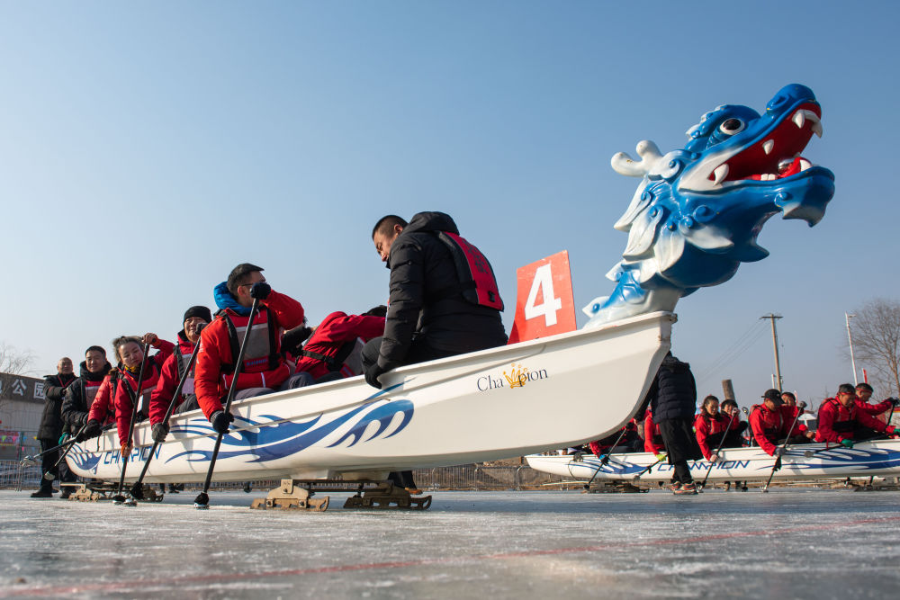 1月13日,市民参加冰上龙舟比赛。当日,第十届全国大众冰雪季暨银川市2024年冰上龙舟赛在宁夏银川阅海公园滑冰场举行。新华社记者 李旭伦 摄